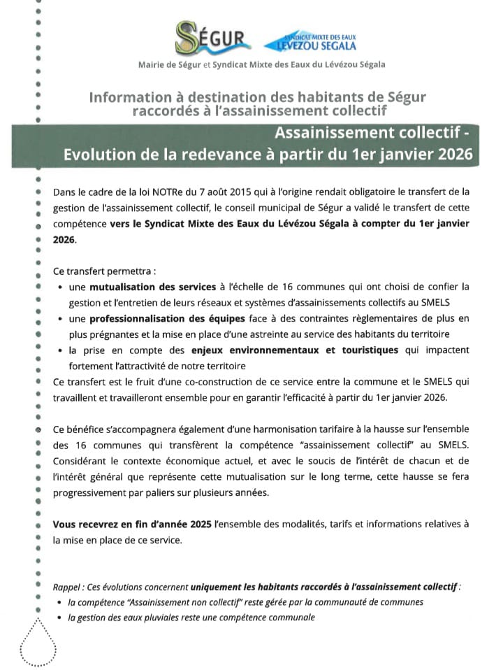 ℹ️Information à destination des habitants de Ségur raccordés à l’assainissement collectif