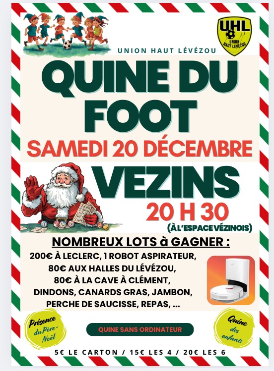 Le club de football Union Haut Lévézou vous donne rendez-vous samedi 20 décembre à 20h30, à Vezins (Espace Vézinois), pour son traditionnel Quine du Foot ! De nombreux lots sont…