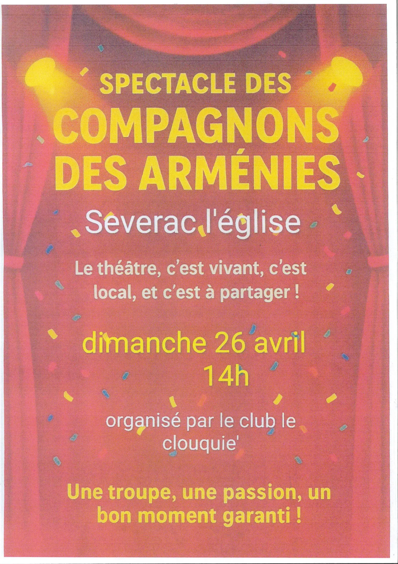 Le Club du Clouquié organise une après-midi théâtre ouvert à tous avec « Les Compagnons des Arménies » à la salle des fêtes de Sévérac l’Eglise. De 14h à 17h30. Au programme : spectacles, danses, théâtre …